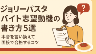 ジョリーパスタのバイト面接で志望動機が思いつかない人向けに、理由・適性・貢献で作る書き方と例文5選、履歴書の書き方、自己PRやシフト相談のコツまで分かりやすく解説します。