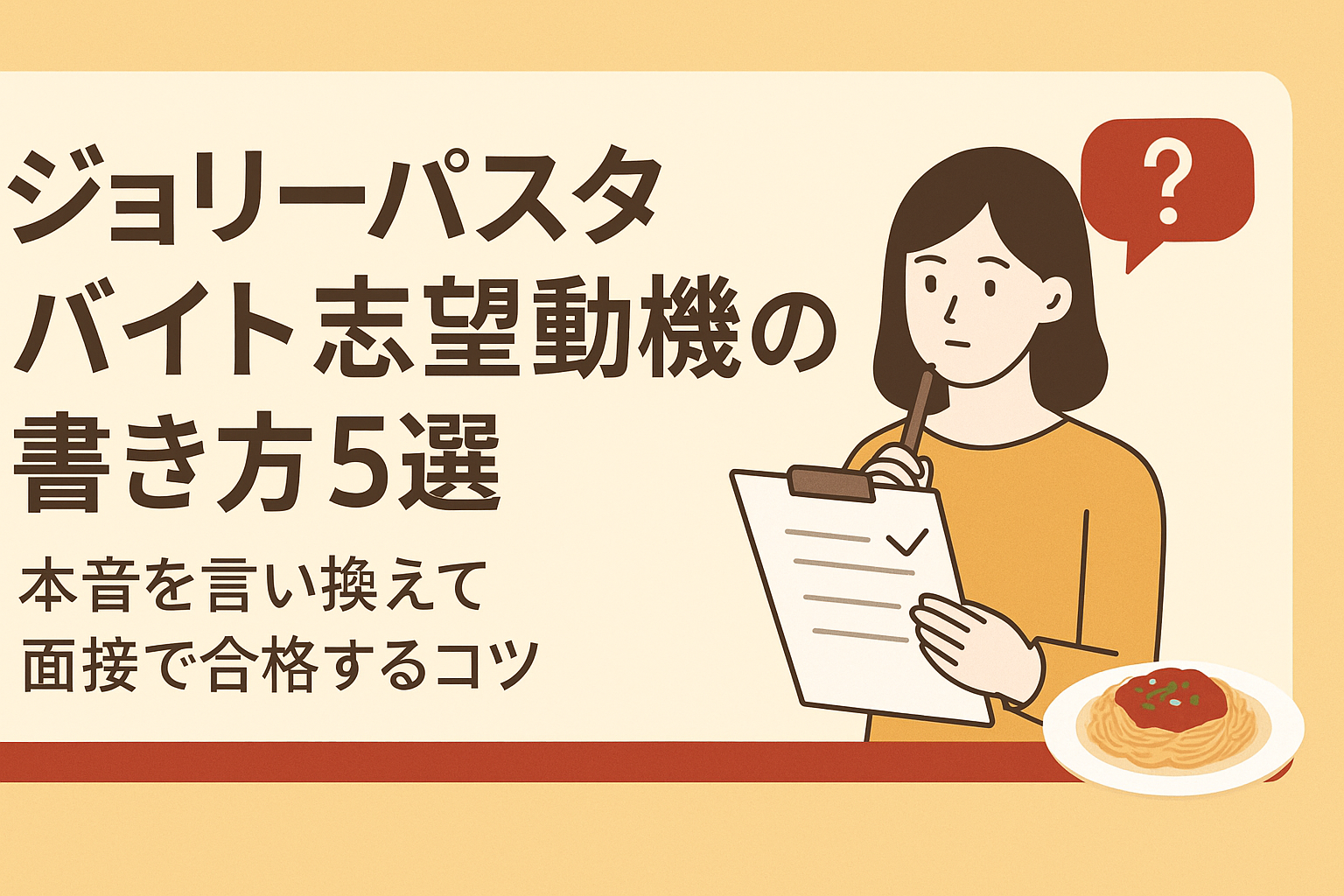 ジョリーパスタの面接では、志望動機の伝え方につまずく人が多く、初めてのアルバイトを考えている学生にとっては特に悩みやすいポイントです。